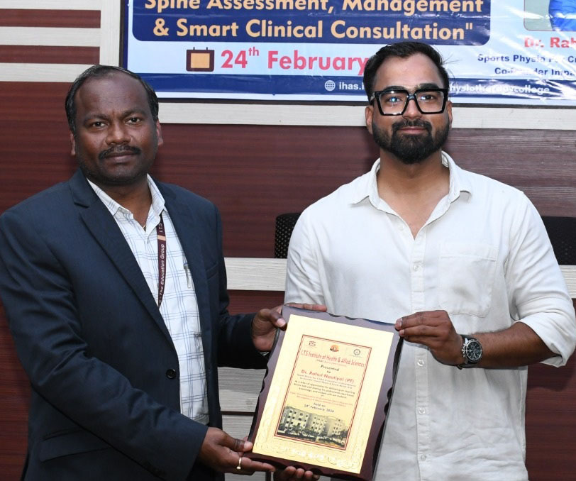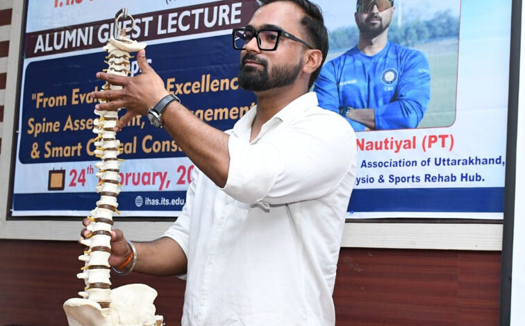 गाजियाबाद। आई0टी0एस फिजियोथेरेपी कालेज में रीढ़ की समस्याओं की जांच उपचार तथा प्रभावी चिकित्सीय परामर्श विषय पर 24 फरवरी को एक विशेष अतिथि व्याख्यान का आयोजन किया गया। इस कार्यक्रम का उदद्ेश्य विद्यार्थियों को रीढ़ संबधी रोगों की सही पहचान, उपचार की योजना तथा रोगियों की उचित मार्गदर्शन देने की जानकारी प्रदान करना था। इस संगोष्ठी को संस्थान के वर्ष 2017-19 एम0पी0टी0 बैच के गौरवशाली पूर्व छात्र डॉ0 राहुल नॉटियाल ने सम्बोधित किया। डॉ0 राहुल उत्तराखंड क्रिकेट संघ के स्पोर्ट्स फिजियोथेरेपिस्ट तथा इम्पैक्ट फिजियो एण्ड स्पोर्ट्स रिहैब हब के सह-संस्थापक हैं। डॉ0 राहुल नौटियाल एक प्रतिष्ठित खेल फिजियोथेरेपिस्ट हैं और वे प्रसिद्ध क्रिकेट खिलाडियों जैसे कि शुभमन गिल के साथ भी काम कर चुके हैं। उन्होंने अपनी शैक्षणिक यात्रा के अनुभव को साझा करते हुए बताया कि आई0टी0एस0 फिजियोथेरेपी कालेज से प्राप्त मजबूत आधार और चिकित्सकीय प्रशिक्षण ने उनके व्यावसायिक जीवन को नई दिशा दी।