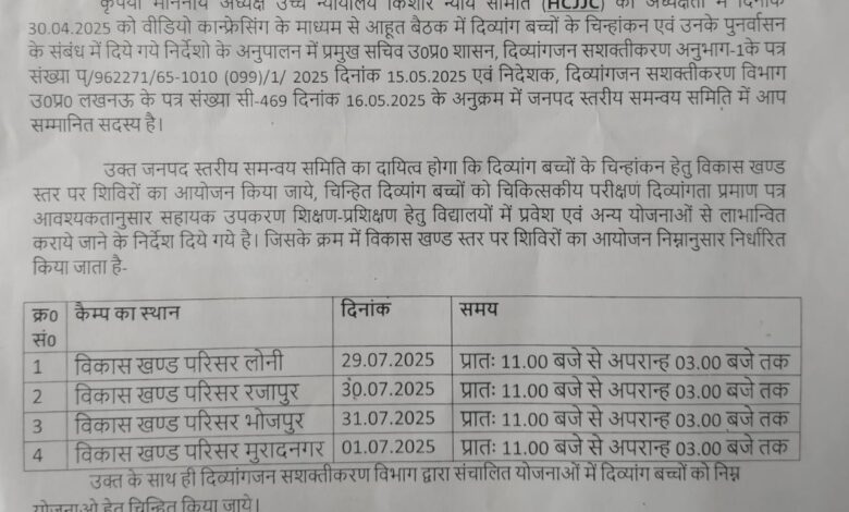 गाजियाबाद। जिला दिव्यांगजन सशक्तीकरण अधिकारी अंशुल चौहान ने प्रेस विज्ञप्ति के माध्यम से अवगत कराया कि अध्यक्ष, उच्च न्यायालय किशोर न्याय समिति की अध्यक्षता में 30.04.2025 को वीडियो कान्फ्रेसिंग के माध्यम से आहूत बैठक में दिव्यांग बच्चों के चिन्हांकन एवं उनके पुनर्वासन के संबंध में दिये गये निर्देशों के अनुपालन में प्रमुख सचिव उत्तर प्रदेश शासन, दिव्यांगजन सशक्तीकरण अनुभाग-1 के पत्र एवं निदेशक, दिव्यांगजन सशक्तीकरण विभाग उत्तर प्रदेश लखनऊ के पत्र के अनुक्रम में जनपद स्तरीय समन्वय समिति में आप सम्मानित सदस्य हैं। उक्त जनपद स्तरीय समन्वय समिति का दायित्व होगा कि दिव्यांग बच्चों के चिन्हांकन हेतु विकास खण्ड स्तर पर शिविरों का आयोजन किया जाये, चिन्हित दिव्यांग बच्चों को चिकित्सकीय परीक्षण दिव्यांगता प्रमाण पत्र आवश्यकतानुसार सहायक उपकरण शिक्षण-प्रशिक्षण हेतु विद्यालयों में प्रवेश एवं अन्य योजनाओं से लाभान्वित कराये जाने के निर्देश दिये गये हैं। जिसके क्रम में विकास खण्ड स्तर पर शिविरों का आयोजन किया जाना निर्धारित है। इसी क्रम में विकास खण्ड परिसर लोनी में 29.07.2025 यानी आज मंगलवार को शिविर आयोजित किया गया। विकास खण्ड परिसर रजापुर में 30.07.2025, विकास खण्ड परिसर भोजपुर में 31.07.2025 व विकास खण्ड परिसर मुरादनगर में 01.08.2025 को प्रात: 11.00 बजे से अपरान्ह 03.00 बजे तक होगा।