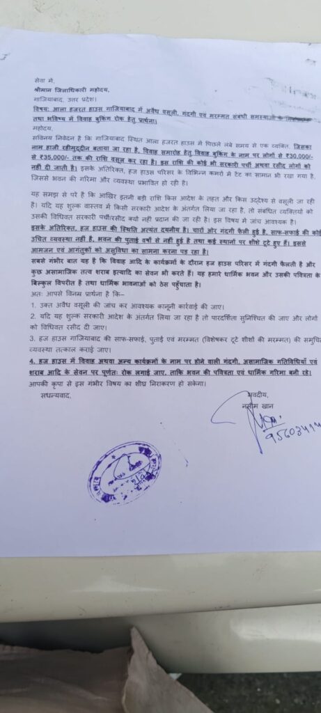 गाजियाबाद। विवादों में एवं चर्चित रहा हज हाउस एक बार फिर चर्चाओं और आरोपों के घेरे में आ गया है। कांग्रेस के वरिष्ठ नेता नसीम खान के नेतृत्व में स्थानीय लोगों ने डीएम को शिकायती पत्र सौंपते हुए आरोप लगाया है कि हज हाउस में विवाह-समारोह आयोजित कराए जा रहे हैं। जिलाधिकारी ने शिकायत को गंभीरता से लिया और तुरंत जांच के आदेश दिए हैं।