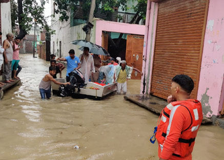 गाजियाबाद। हरियाणा प्रदेश के हथिनी कुंड (ताजेवाला) बैराज से छोड़े जा रहे अत्यधिक जल की मात्रा को दृष्टिगत रखते हुए जनपद गाजियाबाद के तहसील लोनी क्षेत्रान्तर्गत ग्राम बदरपुर, मीरपुर हिन्दू, पचायरा, इलायचीपुर, लुत्फुल्लापुर नवादा, अल्लीपुर में बढ़े हुए जलस्तर एवं प्रभावित परिवारों को आवश्यक सुविधाएं उपलब्ध कराने हेतु जिलाधिकारी गाजियाबाद के निर्देशों के अनुपालन में 3 सितंबर को अपर जिलाधिकारी (वित्त एवं राजस्व) सौरभ भट्ट, ज्वाईंट मजिस्ट्रेट/उपजिलाधिकारी लोनी दीपक सिंघनवाल एवं तहसीलदार लोनी डॉ. अरूण कुमार अग्रवाल द्वारा मुख्य अभियंता, सिंचाई विभाग ओखला खण्ड के साथ प्रभावित क्षेत्रो का निरीक्षण किया गया तथा बाढ प्रभावित स्थानो से निकाले गये व्यक्तियों के साथ वार्ता की गयी। अपर जिलाधिकारी (वि०/रा०) गाजियाबाद द्वारा बताया गया कि एन० डी०आर०एफ० टीम द्वारा ग्राम बदरपुर से लोगो को नाव की सहायता से निकाला जा रहा है। प्रभावित व्यक्तियो के ठहरने हेतु 12 शरणालय स्थल बनाये गये है, जहाँ उनके लिये खाद्य पैकेटो का वितरण कराया जा रहा है। पेयजल की पर्याप्त की व्यवस्था है। प्रशासन द्वारा प्रभावित परिवारो की सूची तैयार कर ली गयी है। प्रभावित परिवारों के मवेशियो हेतु पर्याप्त चारे उपलब्ध कराया गया है। किसी भी आकस्मिकता की स्थिति के लिये नावों एवं गोताखोरो की पर्याप्त व्यवस्था है तथा एनडीआरएफ की टीम मौके पर मौजूद है। पचायरा बाढ़ चौकी पर पर्याप्त स्टाफ की तैनाती की गयी है। ग्राम स्तर पर बाढ़ सुरक्षा समितियों सक्रिय हैं एवं बचाव कार्य में सहयोग कर रही हैं। यमुना नदी का जलस्तर 211.75 मीटर बना हुआ है। जिला प्रशासन द्वारा सतर्क दृष्टि रखी जा रही है तथा स्थिति नियंत्रण में है।