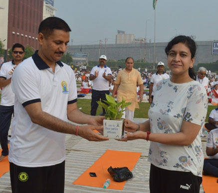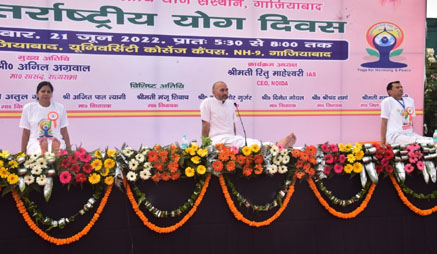 । अंतर्राष्ट्रीय योग दिवस के मौके पर जिले भर में लाखों लोगों ने अलग-अलग जगहों पर हुए योग कार्यक्रमों में उत्साह, उल्लास, उमंग के साथ मानवता के लिए योग थीम पर योग किया। भव्य कार्यक्रम आईएमएस यूनिवर्सिटी कैंपस डासना में किया गया। योग कार्यक्रम में स्कूली बच्चे, पुरुष एवं महिलाएं शामिल हुईं। इसी के साथ तहसील, ब्लाक व विभिन्न सरकारी व निजी संस्थानों में भी योग दिवस पर कार्यक्रमों का आयोजन हुआ। पूरे कार्यक्रम का सफल संयोजन जिलाधिकारी राकेश कुमार सिंह के निर्देशन में क्षेत्रीय आयुर्वेदिक एवं यूनानी अधिकारी डा. अशोक राणा द्वारा किया गया। जिला प्रशासन एवं आयुष विभाग के संयुक्त तत्वावधान में आईएमएस यूनिवर्सिटी कैंपस डासना गाजियाबाद में आयोजित कार्यक्रम का शुभारंभ सांसद अनिल अग्रवाल, कार्यक्रम अध्यक्ष सीईओ नोएडा अथॉरिटी ऋतु महेश्वरी, जिलाधिकारी राकेश कुमार सिंह, मुख्य विकास अधिकारी विक्रमादित्य सिंह मलिक ने किया। इसके बाद कर्नाटक के मैसूर में प्रधानमंत्री नरेंद्र मोदी के कार्यक्रम का सजीव प्रसारण देखा व सुना गया। यह एक ऐसा मौका था, जब जनप्रतिनिधि, जिले भर के अधिकारी और आम नागरिकों ने एक साथ योगाभ्यास किया। इसमें अखिल भारतीय योग संस्था से जुड़े कुशल योग प्रशिक्षक नीरज योगी व उनकी टीम द्वारा योगासन कराए गए जिसमें कॉमन योग प्रोटोकॉल के तहत ग्रीवा शक्ति, घुटना शक्ति, विकासक क्रियाओं, ताड़ासन, वृक्षासन, पादहस्तासन, अर्ध चक्रासन, भद्रासन, वज्रासन, उष्ट्रासन, उत्थान, मंडूकासन, मकरासन, भुजंगासन, शलभासन, सेतुबंधासन, उत्थानपादासन, अर्ध हलासन, पवनमुक्तासन एवं सर्वासन सहित कपालभाति, नाड़ी शोधन, प्राणायाम, शीतली प्राणायाम, भ्रामरी प्राणायाम और ध्यान का अभ्यास कराते हुए प्रतिदिन योगाभ्यास का संकल्प दिलाया गया। आचार्य नीरज योगी जी की देखरेख एवं दिशा निर्देशन में योग प्रशिक्षकों ने इन योगासन और प्राणायम का अभ्यास उपस्थित साधकों को कराया। साथ ही इन योगासनों के शरीर पर पड़ने वाले प्रभावों और निरोगीकाया के लिए इनके महत्व को रेखाकिंत किया। इसके पश्चात राष्ट्रगान के साथ कार्यक्रम का समापन हुआ। आजादी का अमृत महोत्सव के तहत प्रधानमंत्री की प्रेरणा से मानवता के लिए योग थीम पर आधारित आठवें अंतरराष्ट्रीय योग दिवस का आयोजन संपूर्ण जनपद में पूरी भव्यता के साथ किया गया। जनपद भर में लगभग 8 लाख लोगों ने योग क्रिया में प्रतिभाग किया। आठवें अंतरराष्ट्रीय योग दिवस पर मुख्य कार्यक्रम जनपद के आईएमएस यूनिवर्सिटी कैंपस डासना गाजियाबाद में संपन्न हुआ। इस अवसर पर राज्यसभा सांसद अनिल अग्रवाल ने कहा कि आज अंतरराष्ट्रीय योग दिवस पर पूरा विश्व योगमय है। आज भारत में ही नहीं बल्कि दुनिया के कई द